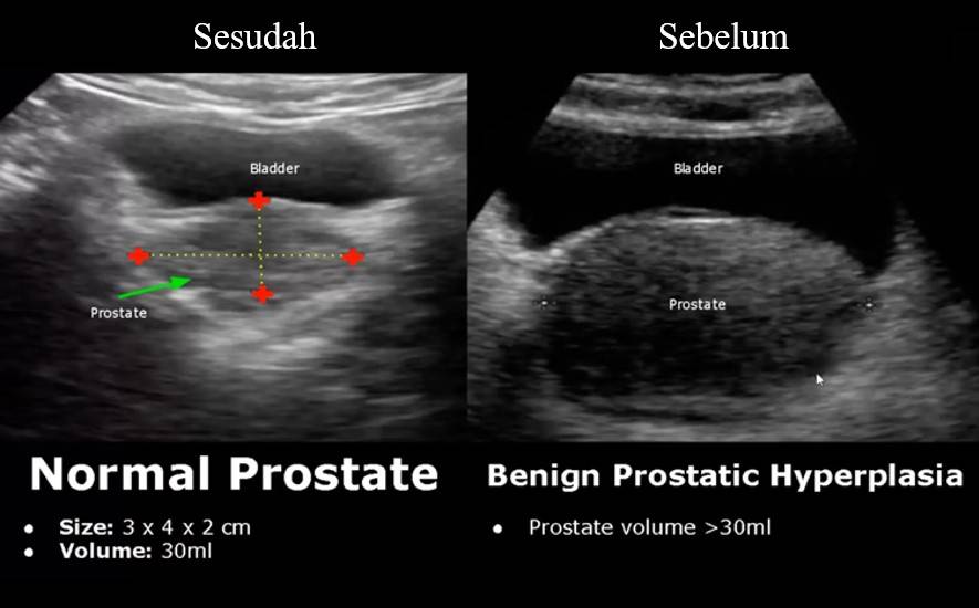 Di bawah ini adalah gambaran prostat normal dan tidak normal, volume normal prostat tidak boleh lebih dari 30 ml.